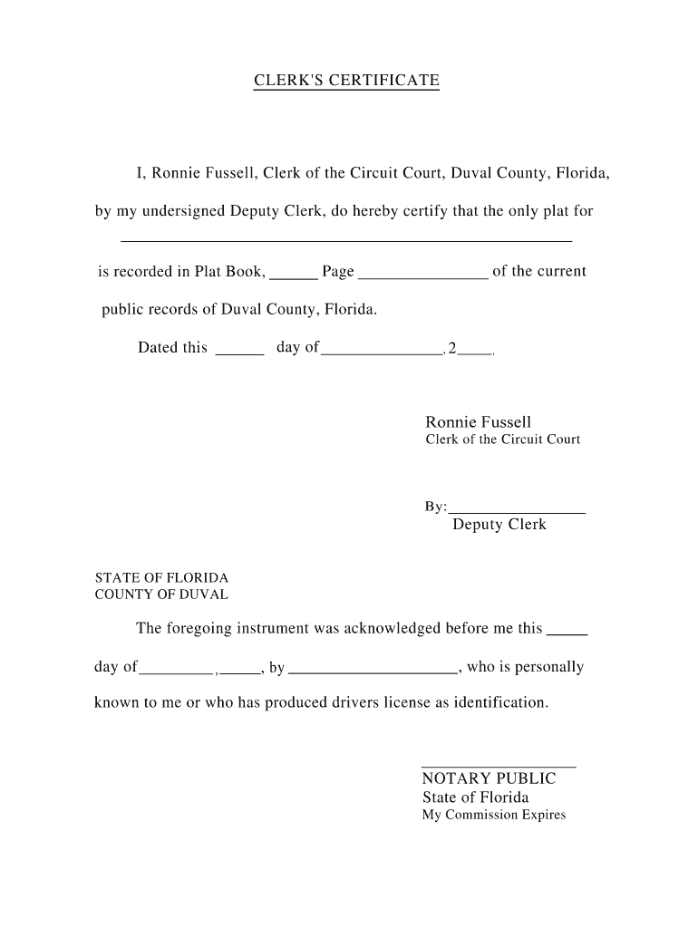 This document certifies the existence of a plat recorded in the public records of Duval County, Florida, and includes details of acknowledgment before a notary public.
