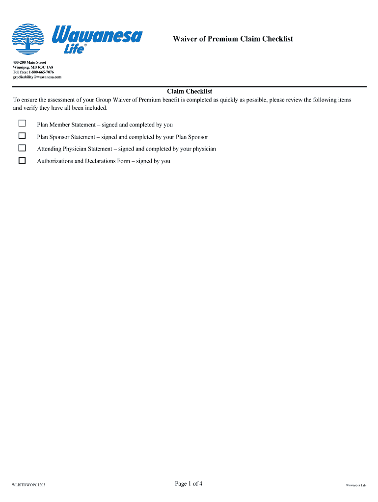 Get the free Waiver of Premium Claim Checklist - wawanesacom