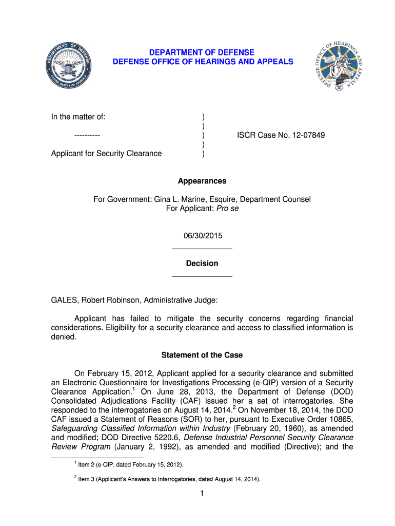 DEPARTMENT OF DEFENSE OFFICE OF HEARINGS AND APPEALS In the matter of:))))) Applicant for Security Clearance ICR Case No. 1207849 Appearances For Government: Gina L. Marine, Esquire, Department Counsel