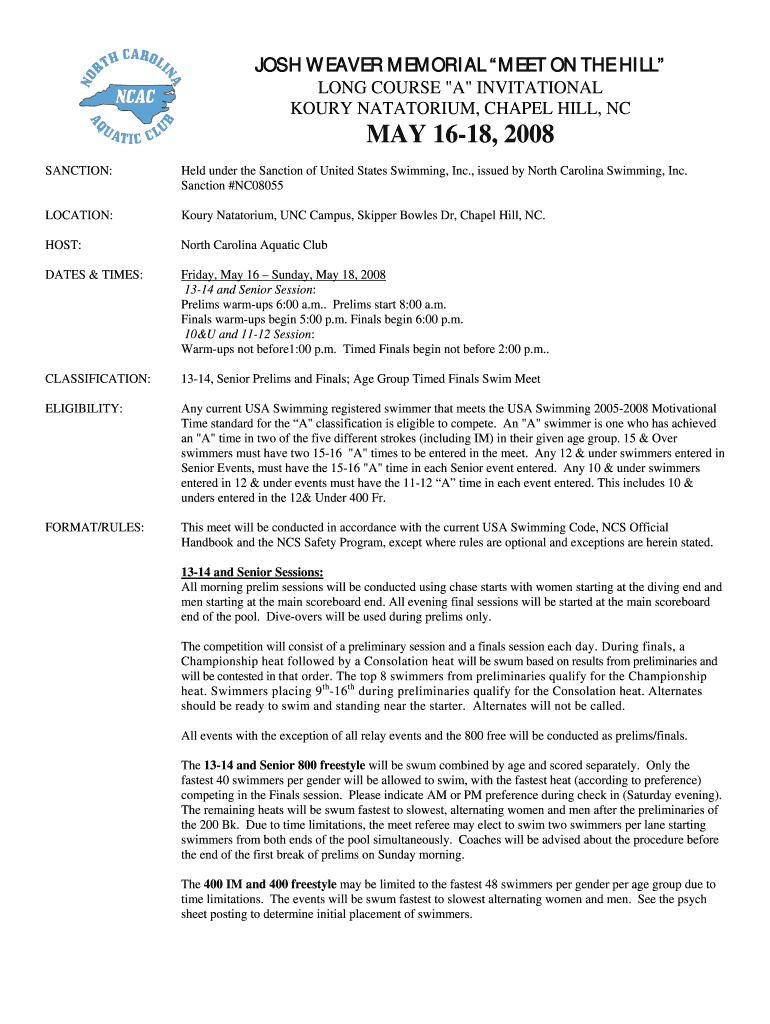 JOSH WEAVER MEMORIAL MEET ON THE HILL LONG COURSE “A” INVITATIONAL KORY SANATORIUM, CHAPEL HILL, NC MAY 16-18, 2008 SANCTION: Held under the Sanction of United States Swimming, Inc., issued by