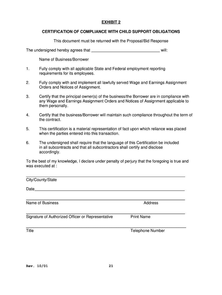 Clear Form EXHIBIT 2 CERTIFICATION OF COMPLIANCE WITH CHILD SUPPORT OBLIGATIONS This document must be returned with the Proposal/Bid Response will: The undersigned hereby agrees that Name of Business/Borrower