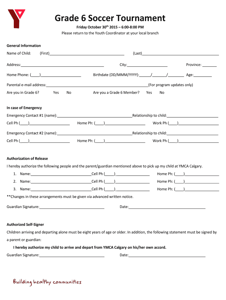 Grade 6 Soccer Tournament Friday, October 30th 2015 6:008:00 PM Please return to the Youth Coordinator at your local branch General Information Name of Child: (First) (Last) Address: City: Home Phone: