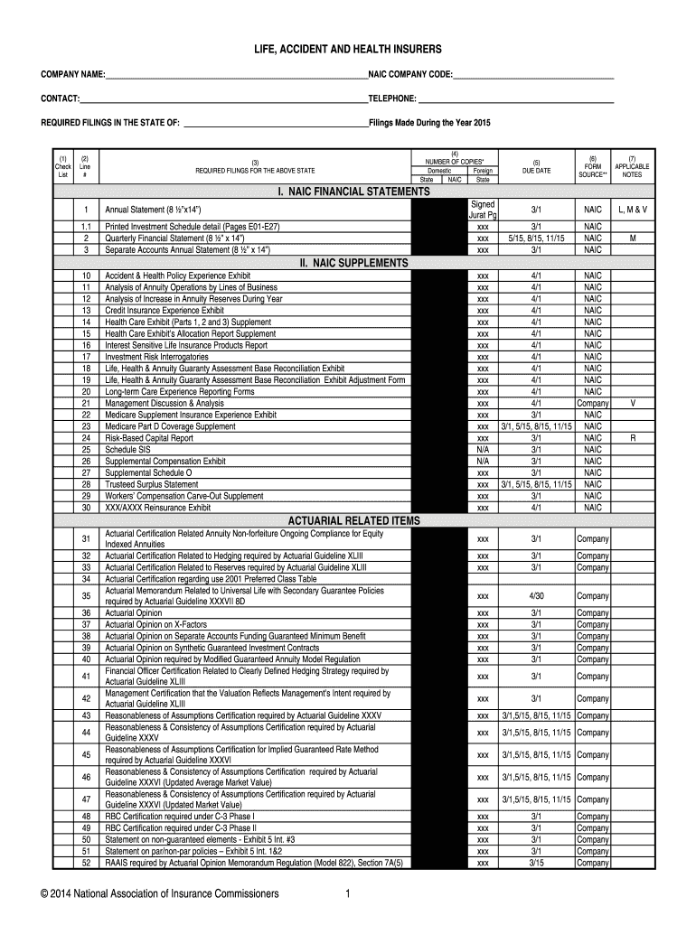 LIFE, ACCIDENT AND HEALTH INSURERS COMPANY NAME: NAIL COMPANY CODE: CONTACT: TELEPHONE: REQUIRED FILINGS IN THE STATE OF: Filings Made During the Year 2015 (1) Check List (2) Line # (4) NUMBER OF