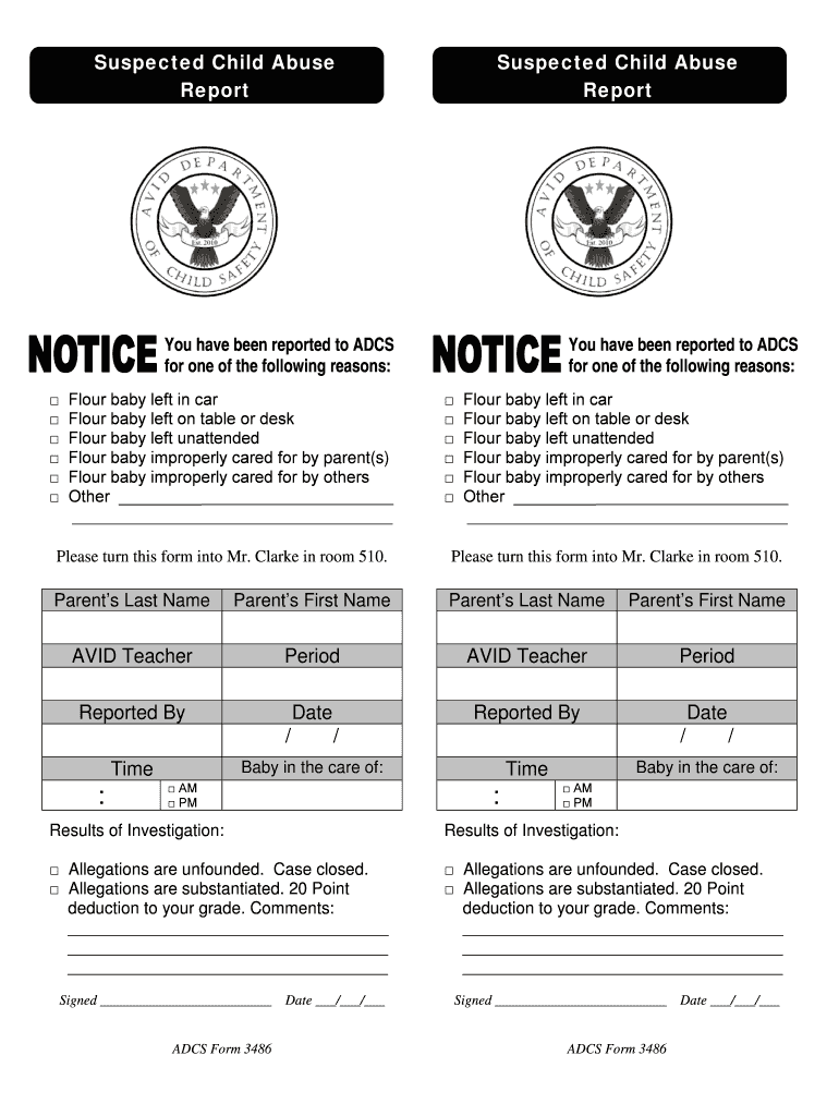 Suspected Child Abuse Report Suspected Child Abuse Report You have been reported to Add for one of the following reasons: Flour baby left in car Flour baby left on table or desk Flour baby left unattended