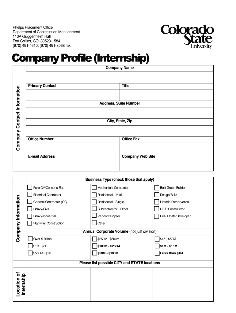 Phelps Placement Office Department of Construction Management 113A Guggenheim Hall Fort Collins, CO 805231584 (970) 4914610; (970) 4913068 fax Company Profile (Internship) Company Contact Information