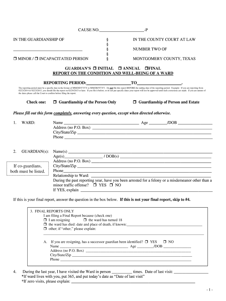 CAUSE NO. —P IN THE GUARDIANSHIP OF MINOR / INCAPACITATED PERSON IN THE COUNTY COURT AT LAW NUMBER TWO OF MONTGOMERY COUNTY, TEXAS GUARDIAN S INITIAL ANNUAL FINAL REPORT ON THE CONDITION AND WELL-BEING