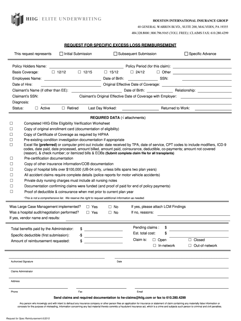 HOUSTON INTERNATIONAL INSURANCE GROUP 40 GENERAL WARREN BLVD., SUITE 200, TAVERN, PA 19355 484.328.8000 800.796.9165 (TOLL FREE) CLAIMS FAX: 610.280.4299 REQUEST FOR SPECIFIC EXCESS LOSS REIMBURSEMENT