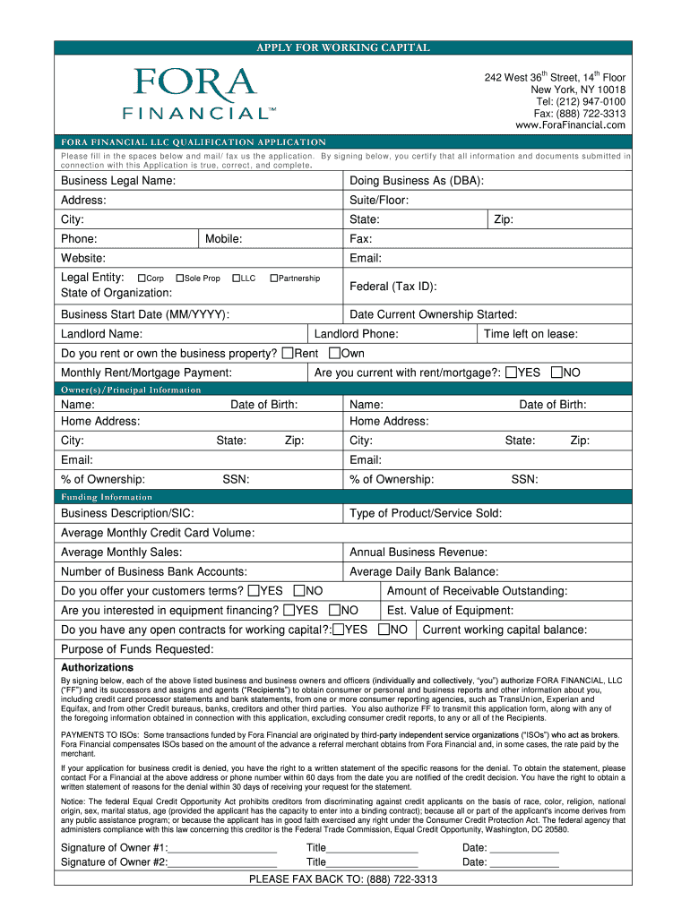 APPLY FOR WORKING CAPITAL TH 242 West 36 Street, 14 Floor New York, NY 10018 Tel: (212) 9470100 Fax: (888) 7223313 www.ForaFinancial.com FORA FINANCIAL LLC QUALIFICATION APPLICATION Please fill in