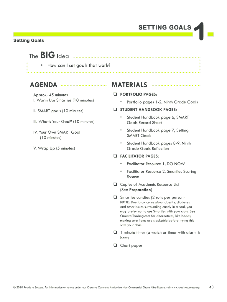 SETTING GOALS 1 The BIG Idea How can I set goals that work? AGENDA MATERIALS Approx. 45 minutes I. Warm Up: Smarties (10 minutes) PORTFOLIO PAGES: II. SMART goals (10 minutes) STUDENT HANDBOOK PAGES: