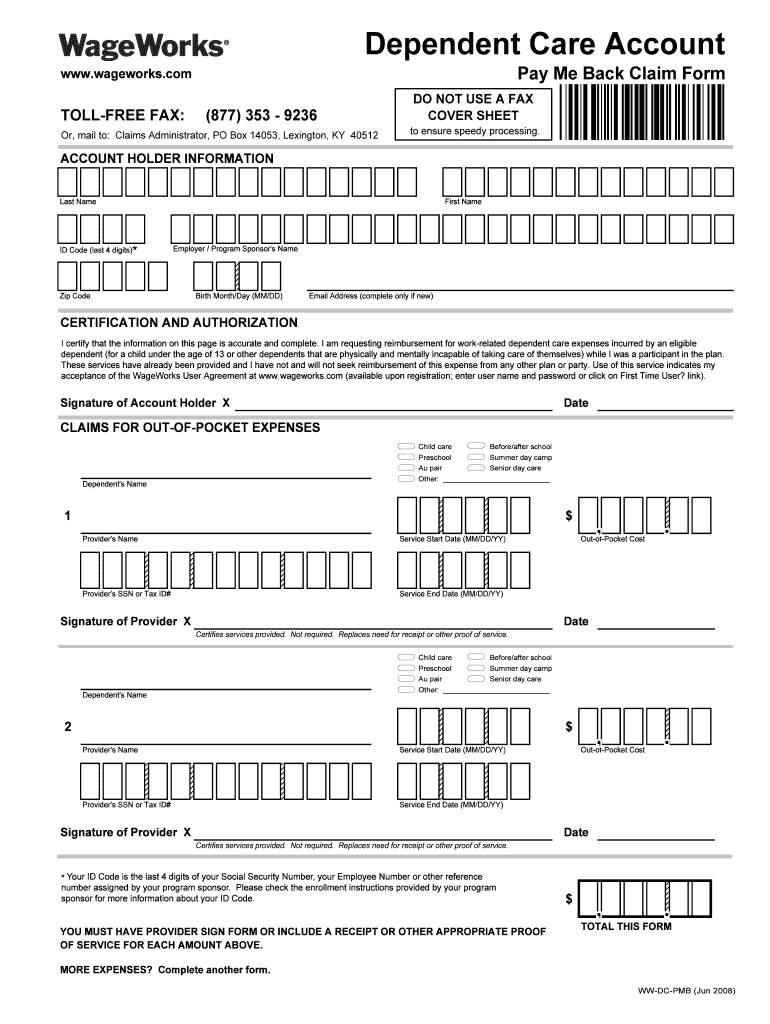 Dependent Care Account www.wageworks.com Pay Me Back Claim Form Waterworks Dependent Claim Form Instructions PLEASE READ THIS BEFORE SUBMITTING YOUR CLAIM FORM Your claim is important. To ensure we