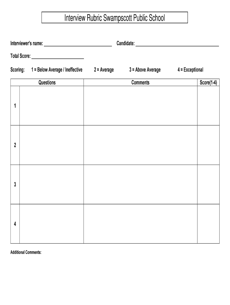 Interview Rubric Swampscott Public School Interviewers name: Candidate: Total Score: Scoring: 1 Below Average / Ineffective Questions 1 2 3 4 Additional Comments: 2 Average 3 Above Average Comments