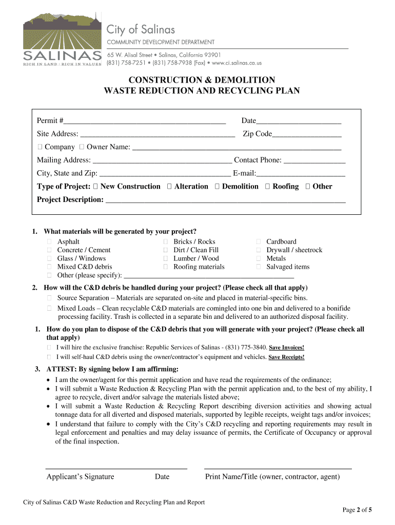 CONSTRUCTION AND DEMOLITION (C&D) DIVERSION REQUIREMENTS Salinas Municipal Code 94.1 requires all Construction and Demolition (C&D) projects within the City to divert at least 50% of the C&D debris