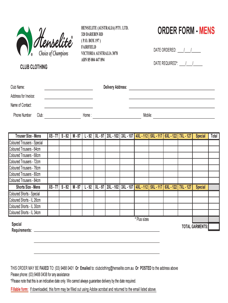 ORDER FORM MEN HENSELITE (AUSTRALIA) PTY. LTD. 320 DARE BIN RD (P.O. BOX 197) FAIRFIELD VICTORIA AUSTRALIA 3078 ABN 85 004 447 894 Choice of Champions CLUB CLOTHING DATE ORDERED: / / DATE REQUIRED*: