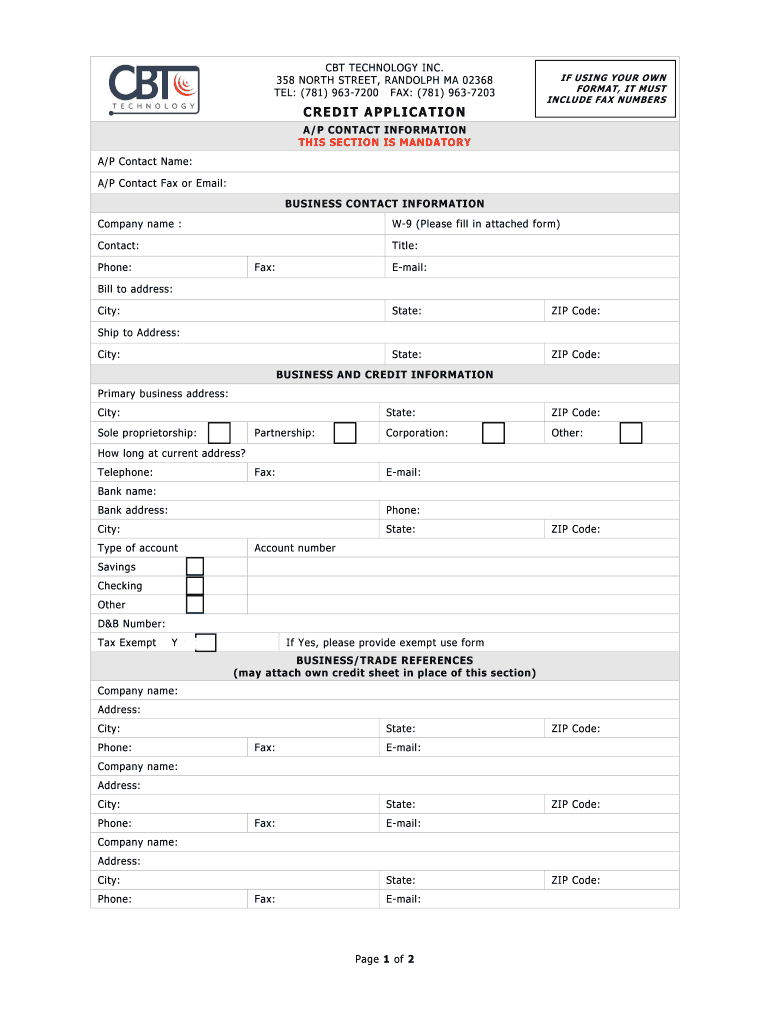 CBT TECHNOLOGY INC. 358 NORTH STREET, RANDOLPH MA 02368 TEL: (781) 9637200 FAX: (781) 9637203 IF USING YOUR OWN FORMAT, IT MUST INCLUDE FAX NUMBERS C RE DI T AP P L I CA TI O N A/P CONTACT INFORMATION