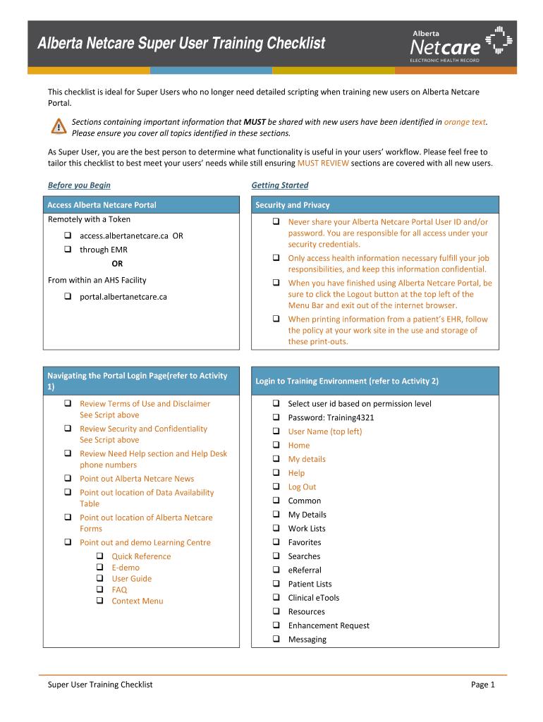This checklist is ideal for Super Users who no longer need detailed scripting when training new users on Alberta Nectar
