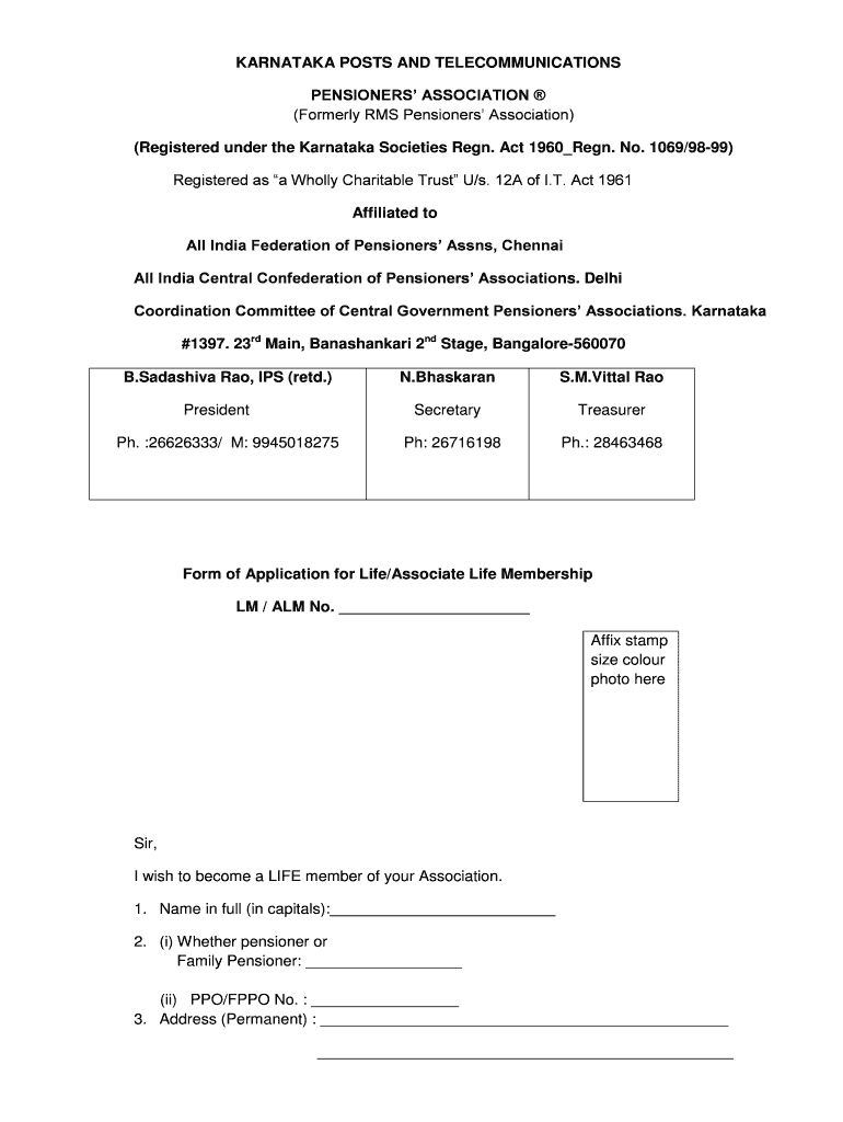 KARNATAKA POSTS AND TELECOMMUNICATIONS PENSIONERS ASSOCIATION (Formerly RMS Pensioners Association) (Registered under the Karnataka Societies Reign. Act 1960 Reign. No. 1069/9899) Registered as a
