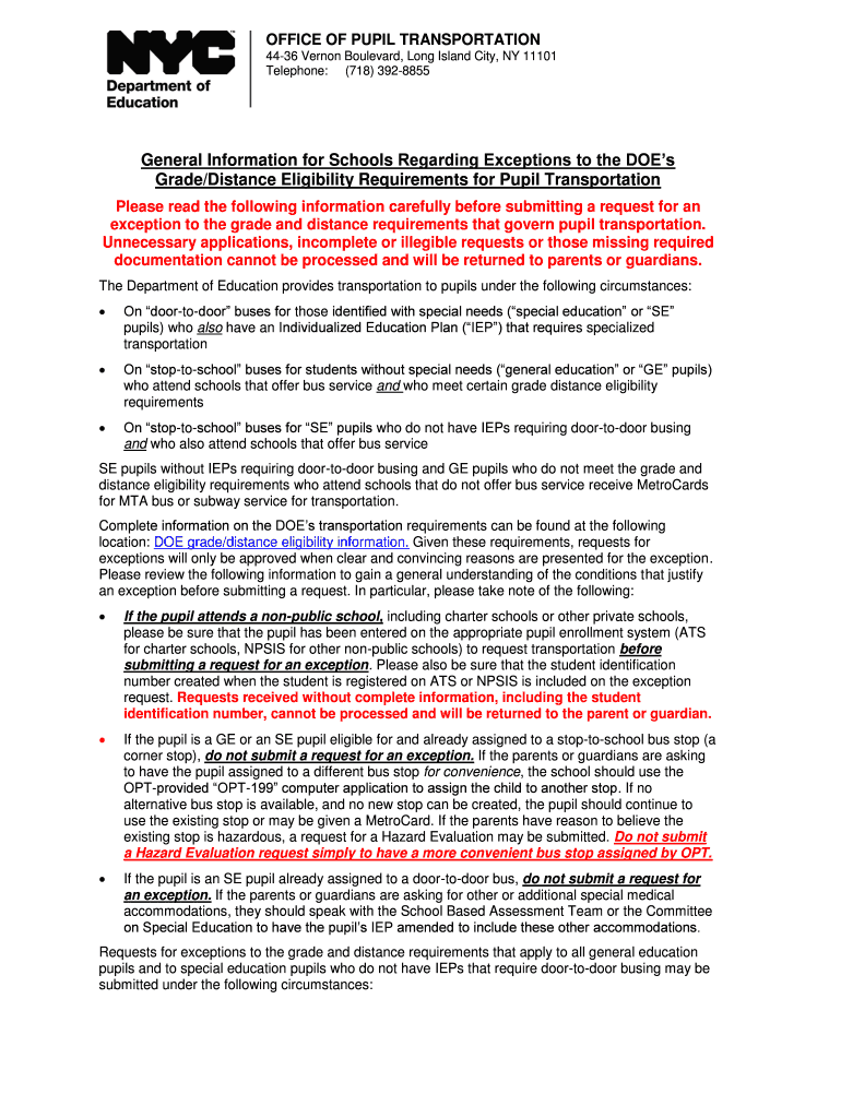 Telephone: (718) 3928855General Information for Schools Regarding Exceptions to the Does