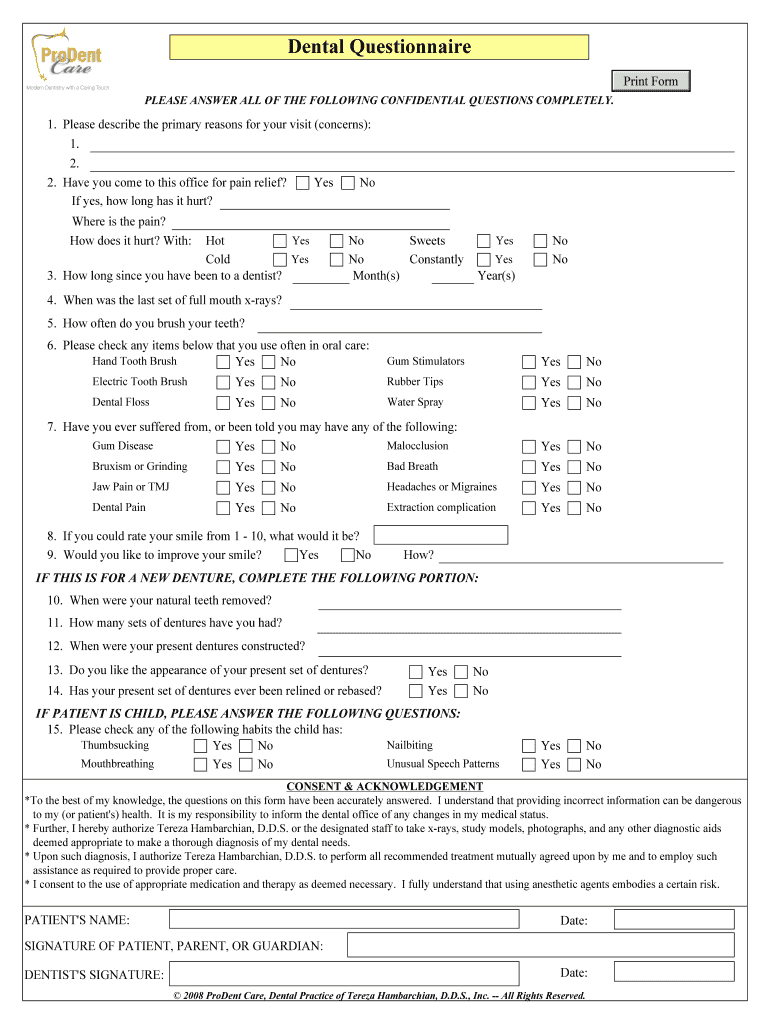 Get the free Dental Questionnaire - ProDent Care Dr Tereza Hambarchian