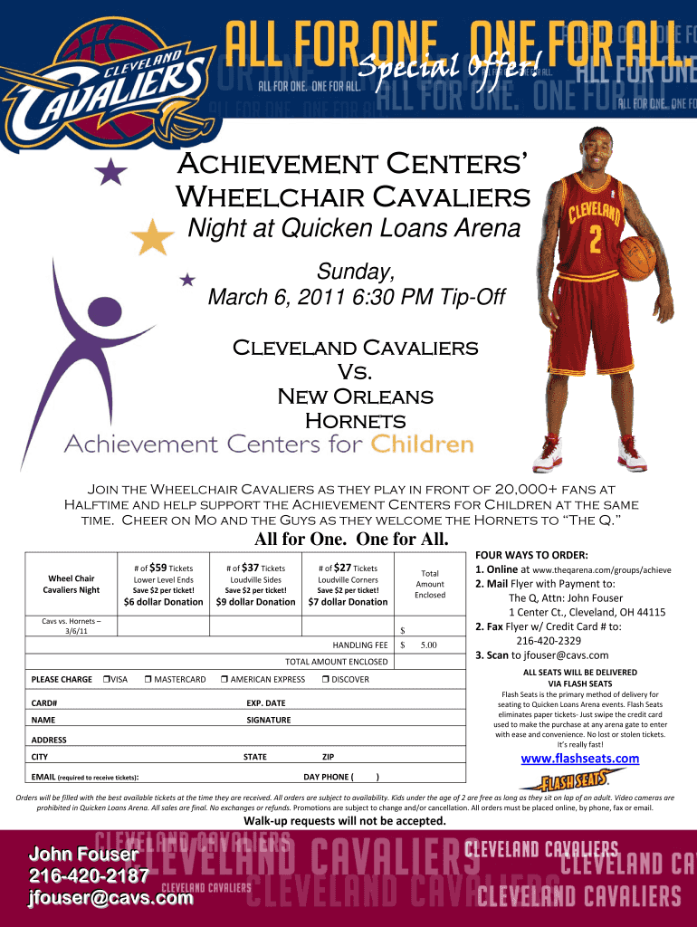 Special Offer! Achievement Centers Wheelchair Cavaliers Night at Quicken Loans Arena Sunday, March 6, 2011 6:30 PM Ripoff Cleveland Cavaliers Vs. New Orleans Hornets Join the Wheelchair Cavaliers