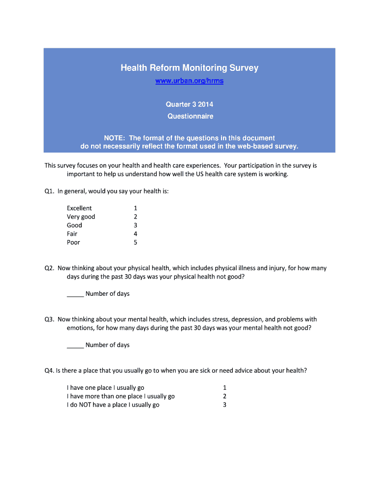 Health Reform Monitoring Survey www.urban.org/hrms Quarter 3 2014 Questionnaire NOTE: The format of the questions in this document do not necessarily reflect the format used in the web based survey.