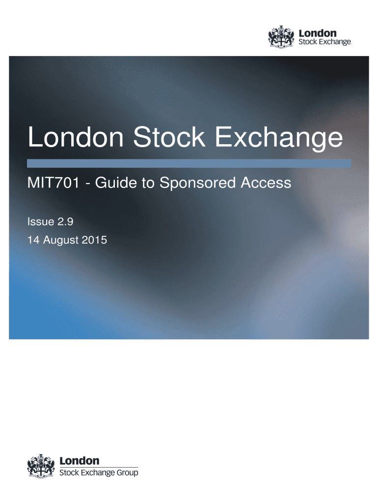 London Stock Exchange MIT701 Guide to Sponsored Access Issue 2.9 14 August 2015 Contents 6.0 1.0 Sponsored Access Overview Providing Sponsored Access 19 5 6.1 5 1.2 2.0 Document History 6 London Stock