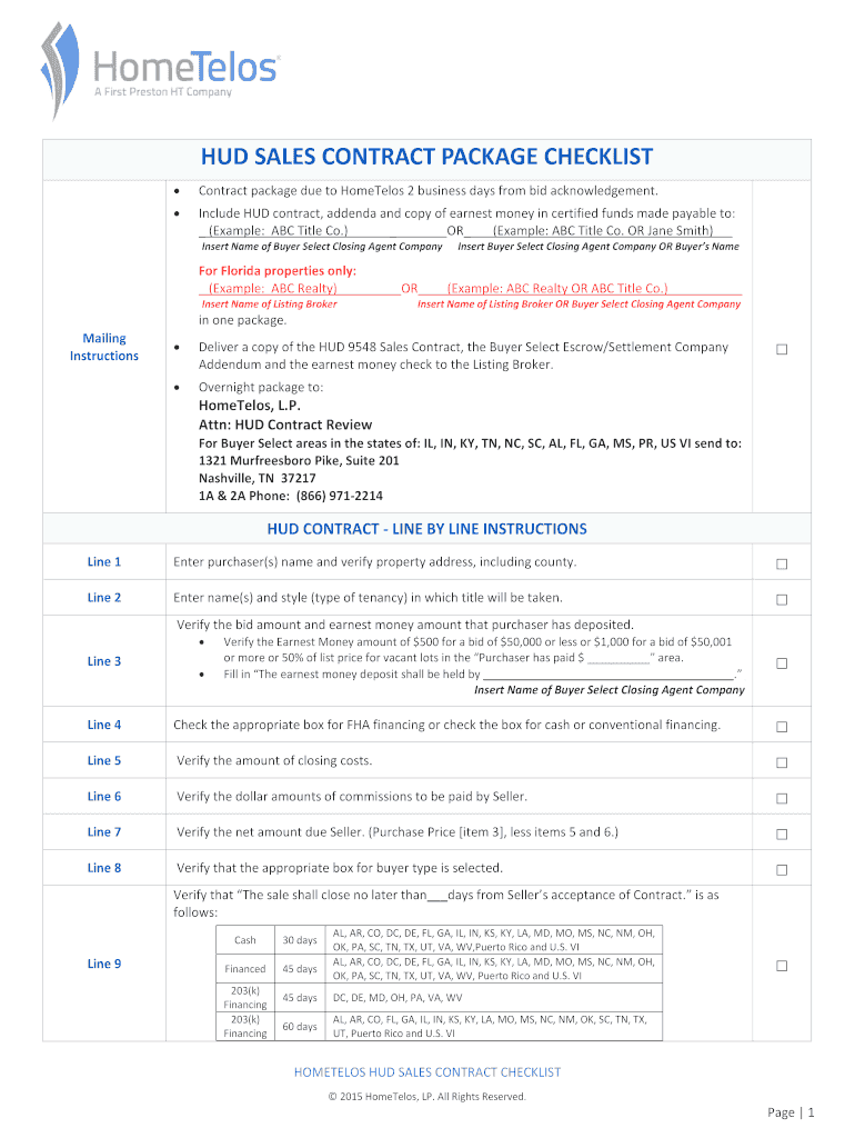 HUD SALES CONTRACT PACKAGE CHECKLIST Contract package due to Homeless 2 business days from bid acknowledgement. Include HUD contract, addenda and copy of earnest money in certified funds made payable