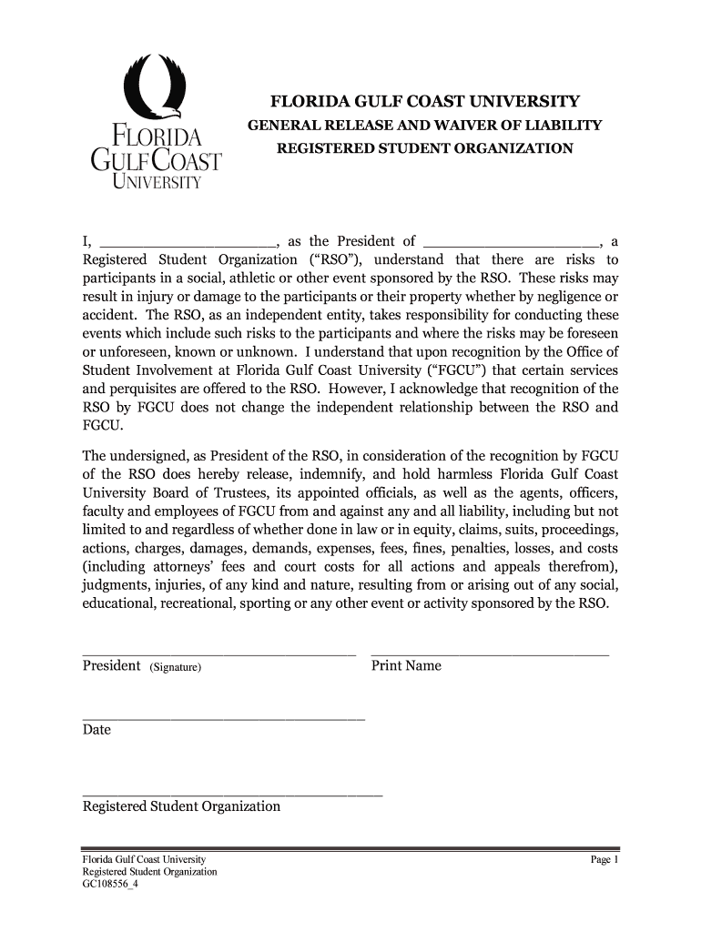 FLORIDA GULF COAST UNIVERSITY GENERAL RELEASE AND WAIVER OF LIABILITY REGISTERED STUDENT ORGANIZATION I, as the President of, a Registered Student Organization (RSO), understand that there are risks