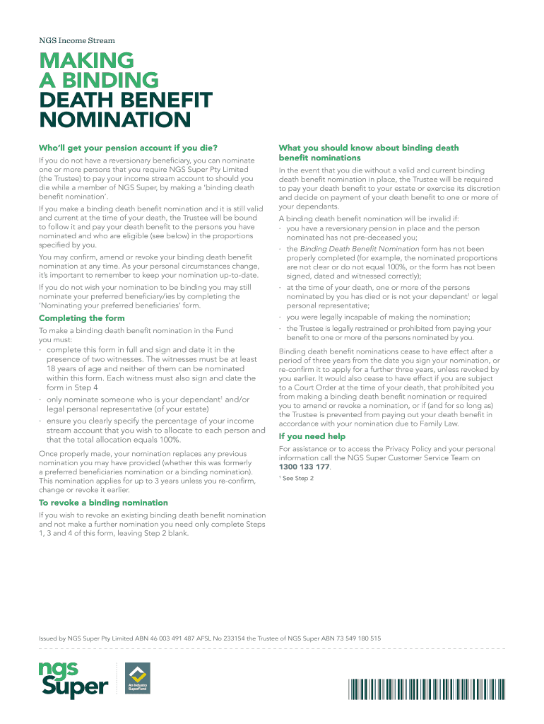 NGS Income Stream MAKING A BINDING DEATH BENEFIT NOMINATION Who'll get your pension account if you die? If you do not have a diversionary beneficiary, you can nominate one or more persons that you