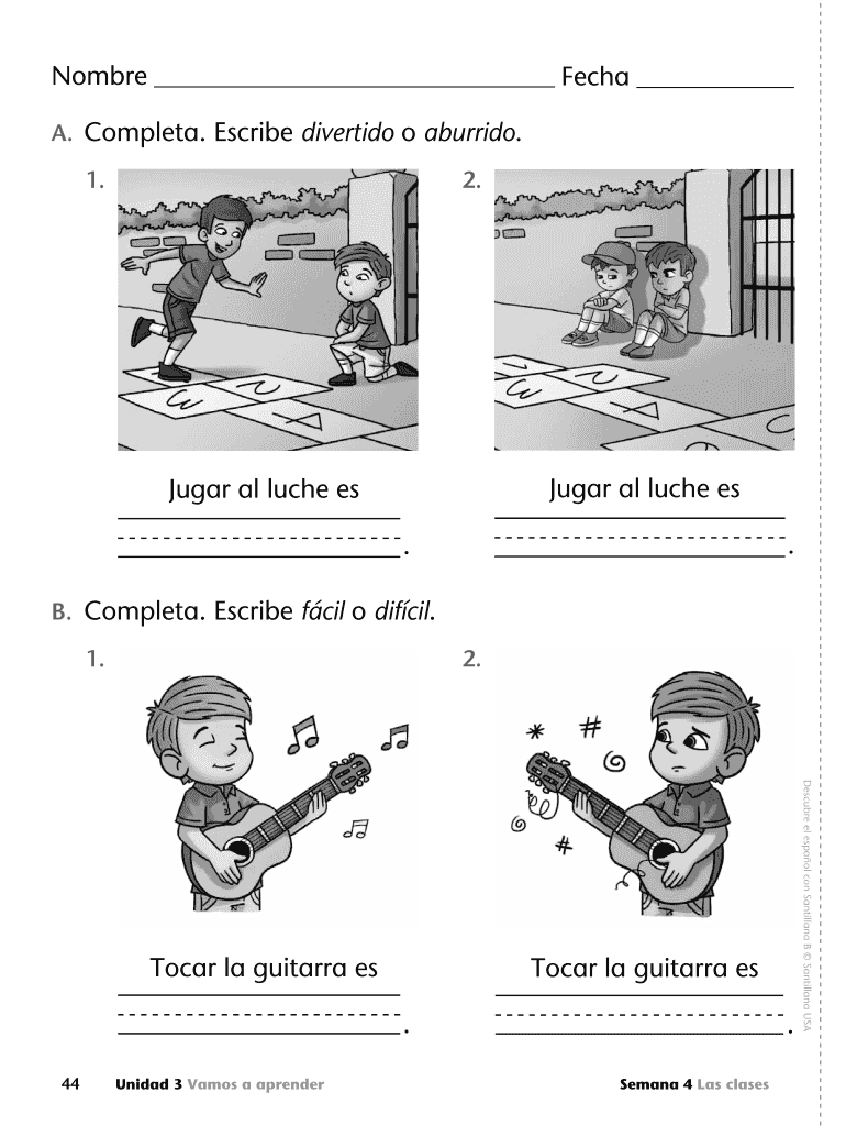 Hombre Tech A. Complete. Describe diverted o burrito. 1. 2. Sugar all Luce BS Sugar all Luce BS. . B. Complete. Describe fail to distil. 1. 2. To car la guitar BS. 44 Unidad 3 Amos a render. Demand