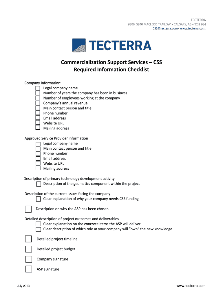BECERRA #306, 5940 MacLeod TRAIL SW CALGARY, AB T2H 2G4 CSS tecterra.com www.tecterra.com Commercialization Support Services CSS Required Information Checklist Company Information: o Legal company
