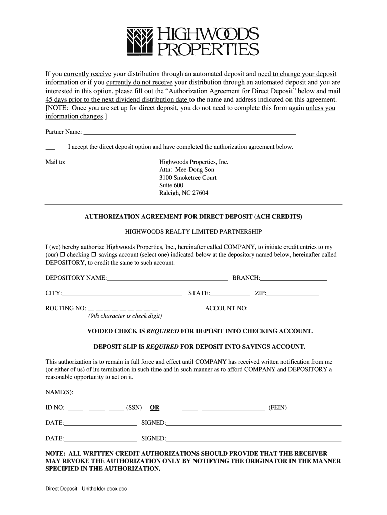 This document outlines the process for changing or initiating direct deposit for dividend distributions through Highwoods Properties, Inc. It includes sections for partner information and bank details