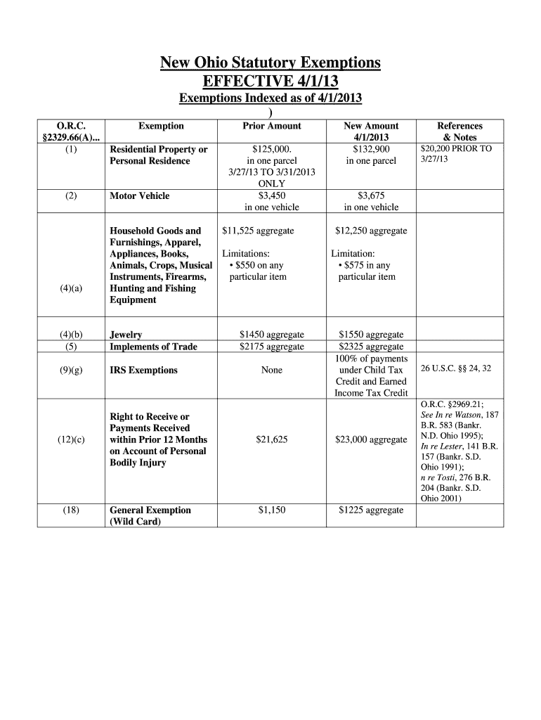 New Ohio statutory exemptions refer to new laws or regulations that specify certain properties or assets that are protected from being seized by creditors in bankruptcy cases or other legal situations.