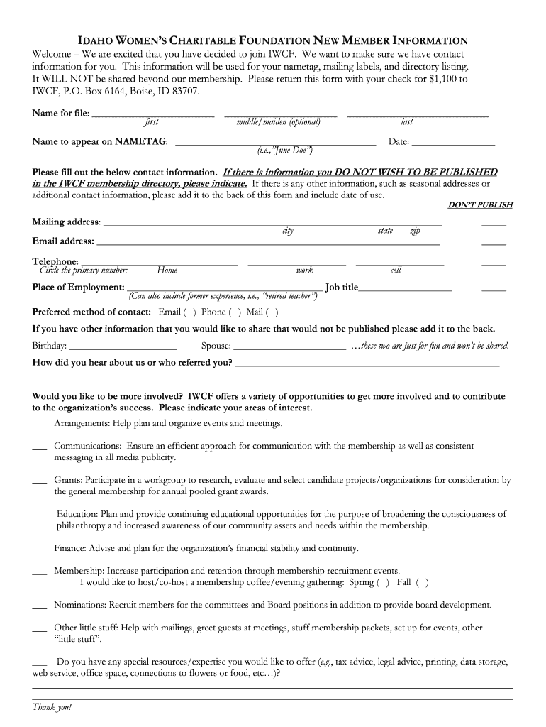 IDAHO WOMEN CHARITABLE FOUNDATION NEW MEMBER INFORMATION Welcome We are excited that you have decided to join ICCF. We want to make sure we have contact information for you. This information will