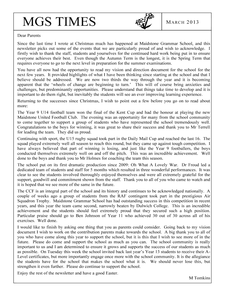 MGS TIMES M ARC H 2 013 Dear Parents Since the last time I wrote at Christmas much has happened at Maidstone Grammar School, and this newsletter picks out some of the events that we are particularly
