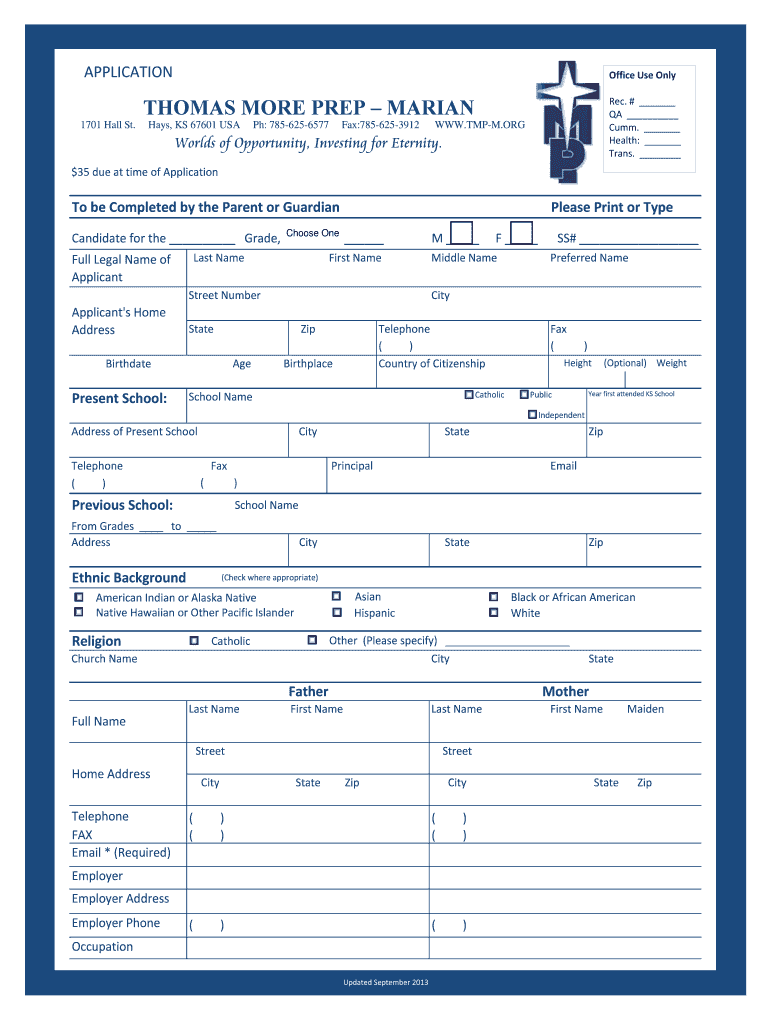 APPLICATION Office Use Only THOMAS MORE PREP MARIAN 1701 Hall St. Hays, KS 67601 USA pH: 7856256577 Fax:7856253912 Rec. # QA CCMM. Health: Trans. WWW.TPM.ORG Worlds of Opportunity, Investing for Eternity.