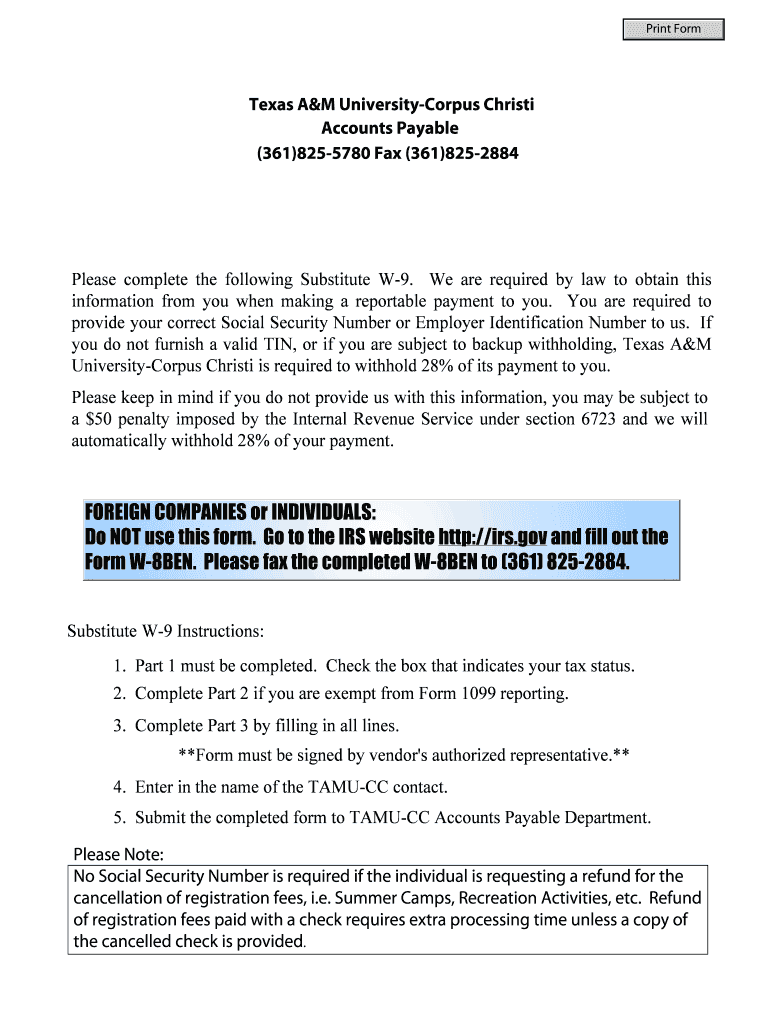 Print Form Texas A&M UniversityCorpus Christi Accounts Payable (361)8255780 Fax (361)8252884 Please complete the following Substitute W9. We are required by law to obtain this information from you