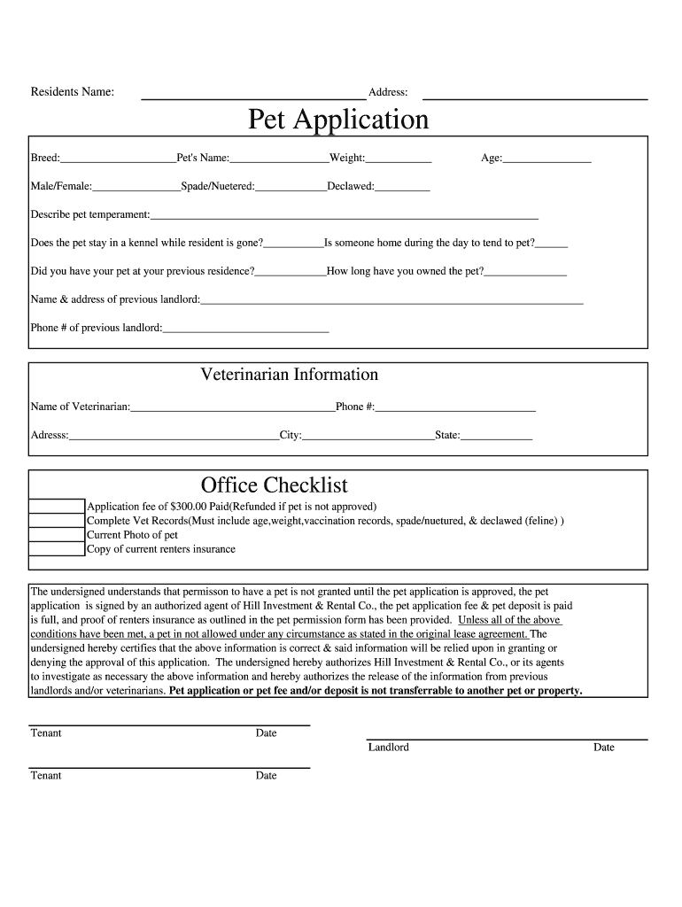 Residents Name: Address: Pet Application Breed: Pet's Name: Weight: Age: Male/Female: Spade/Neutered: Declawed: Describe pet temperament: Does the pet stay in a kennel while resident is gone? Is someone