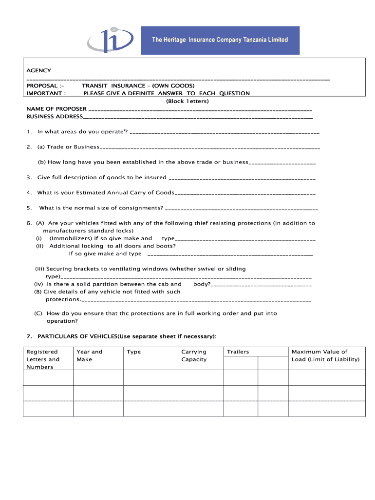 AGENCY : PROPOSAL : TRANSIT INSURANCE (OWN GOODS) IMPORTANT : PLEASE GIVE A DEFINITE ANSWER TO EACH QUESTION (Block (Block 1etters) NAME OF PROPOSER BUSINESS ADDRESS 1. In what areas do you operate
