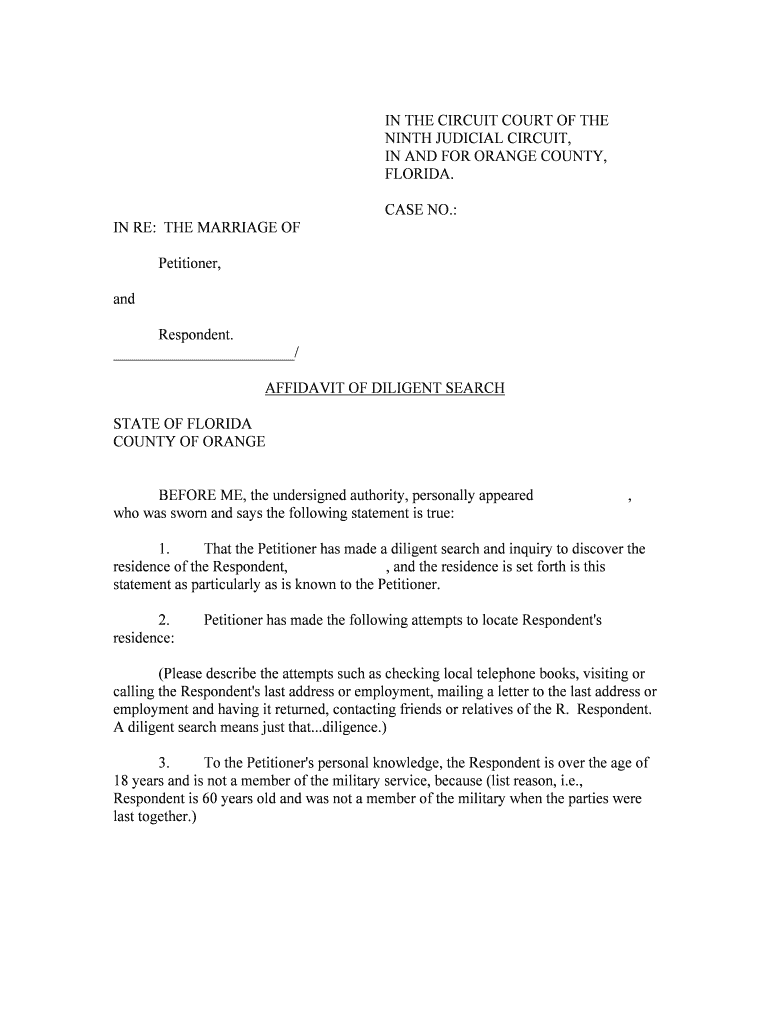 IN THE CIRCUIT COURT OF THE NINTH JUDICIAL CIRCUIT, IN AND FOR ORANGE COUNTY, FLORIDA. CASE NO.: IN RE: THE MARRIAGE OF Petitioner, and Respondent. / AFFIDAVIT OF DILIGENT SEARCH STATE OF FLORIDA
