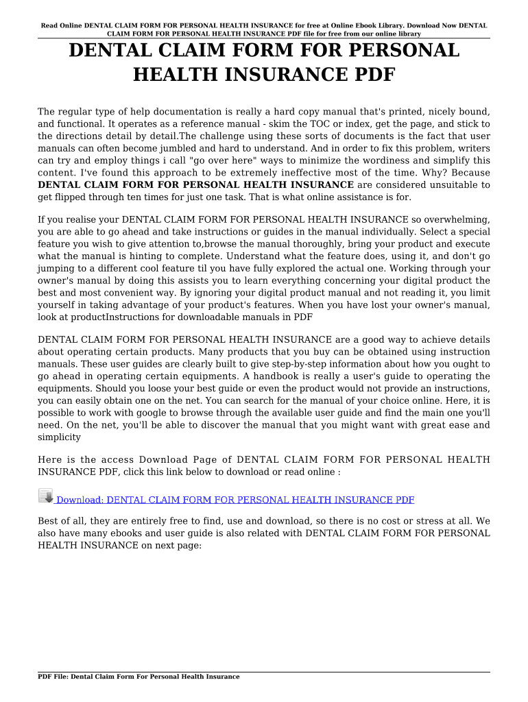 Read Online DENTAL CLAIM FORM FOR PERSONAL HEALTH INSURANCE for free at Online E-Book Library. Download Now DENTAL CLAIM FORM FOR PERSONAL HEALTH INSURANCE PDF file for free from our online library