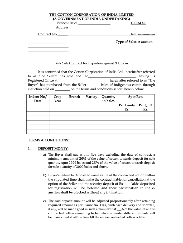 THE COTTON CORPORATION OF INDIA LIMITED (A GOVERNMENT OF INDIA UNDERTAKING) Branch Office: FORMAT Address Contract No. Date: Type of Sales: auction Sub: Sale Contract for Exporters against H form