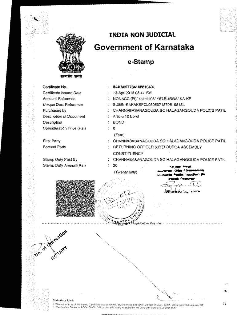 INDIA NON-JUDICIAL Government of Karnataka stamp Alma. Certificate No. INKA69773418881040L Certificate Issued Date 13Apr201305:41 PM Account Reference NONACC ®/ kaksfol06/ BELUGA/ AKP Unique Doc.