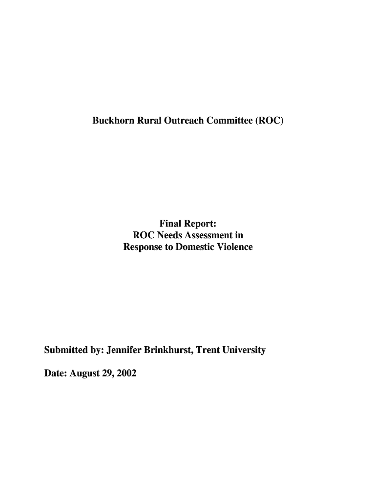 Buck horn Rural Outreach Committee (ROC) Final Report: ROC Needs Assessment in Response to Domestic Violence Submitted by: Jennifer Pankhurst, Trent University Date: August 29, 2002, TABLE OF CONTENTS