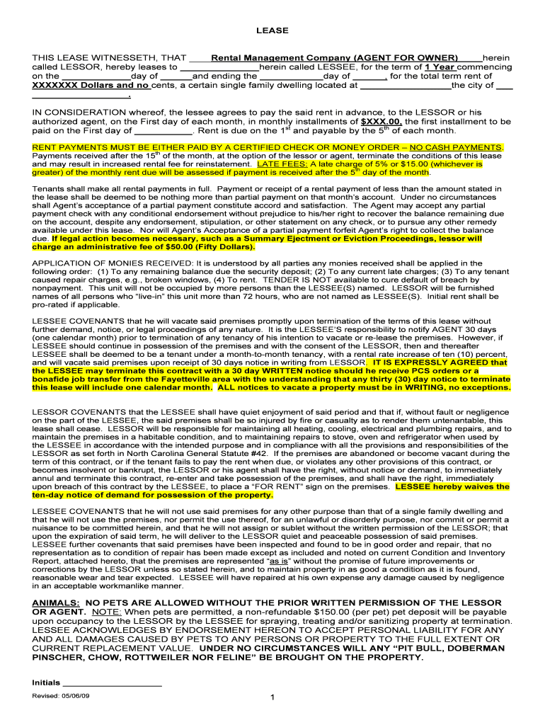 LEASE THIS LEASE WITNESSED, THAT Rental Management Company (AGENT FOR OWNER) herein called LESSOR, hereby leases to herein called LESSEE, for the term of 1 Year commencing on the day of and ending