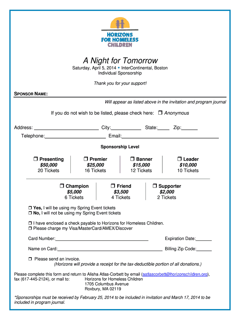 25th Anniversary Spring Event A Night for Tomorrow Individual Sponsorship Opportunities Saturday, April 5, 2014, InterContinental, Boston Presenting: $50,000 Listing in invitation and program journal*