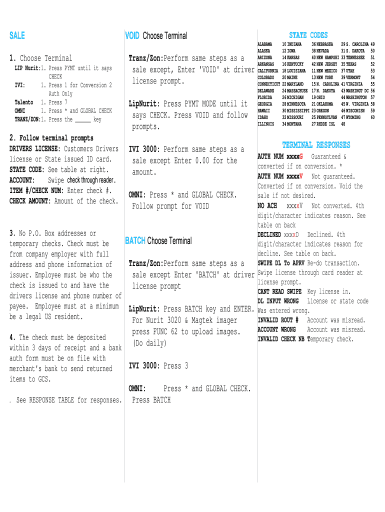 SALE 1. Choose Terminal LIP Unit:1. Press PMT until it says CHECK IVI: 1. Press 1 for Conversion 2 Auth Only Talent 1. Press 7 OFNI 1. Press * and GLOBAL CHECK TRANS/ON:1. Press the key VOID Choose