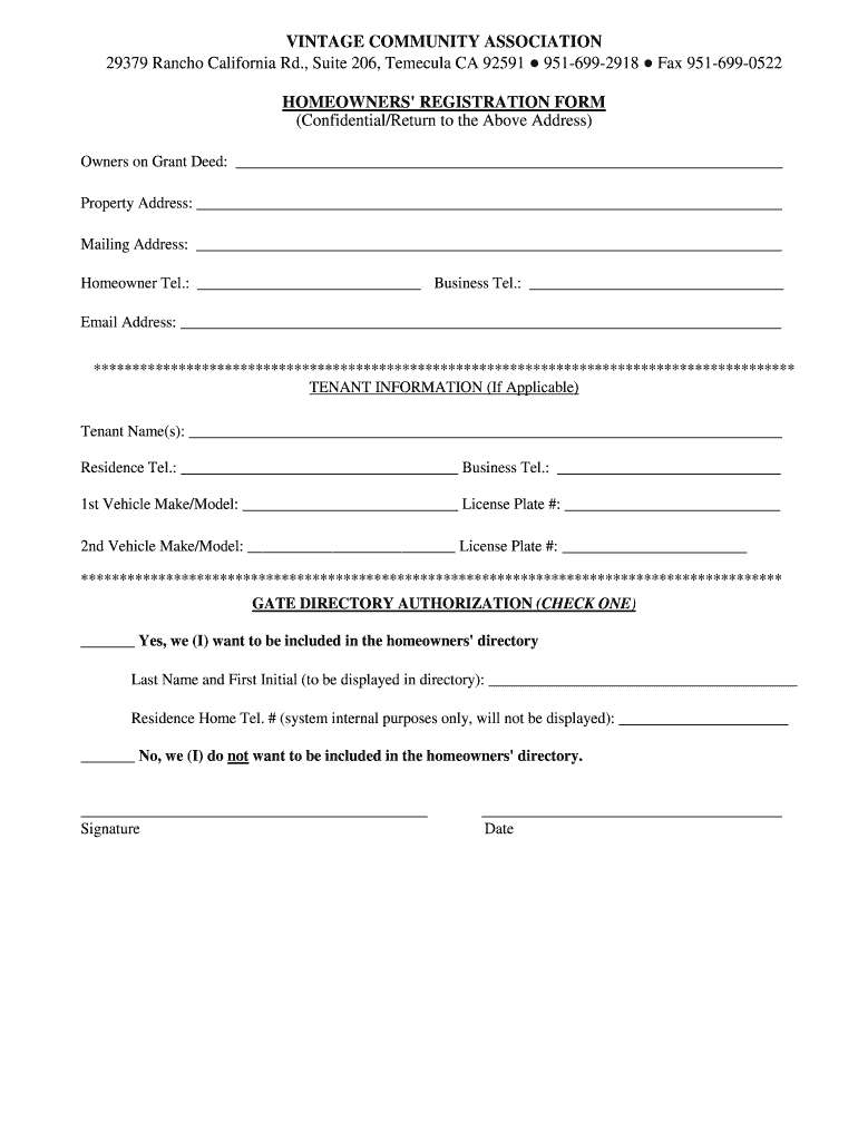 VINTAGE COMMUNITY ASSOCIATION 29379 Rancho California Rd., Suite 206, Temecula CA 92591 9516992918 Fax 9516990522 HOMEOWNERS REGISTRATION FORM (Confidential/Return to the Above Address) Owners on