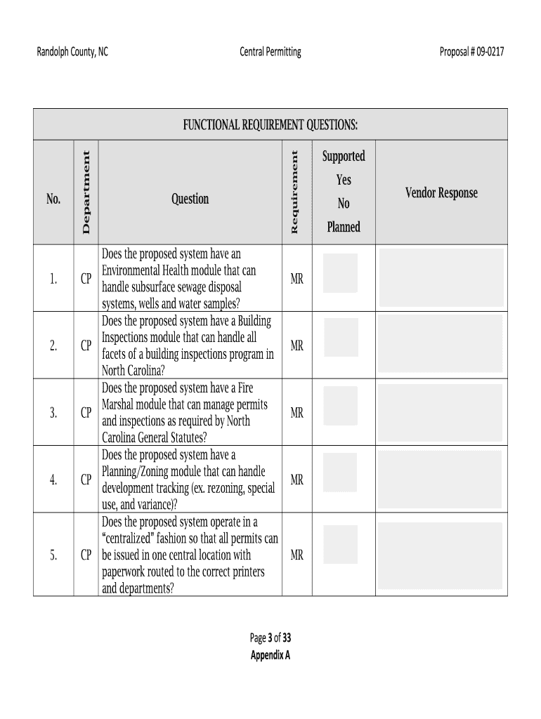 Randolph County, NC Central Permitting Proposal # 090217 Appendix A FUNCTIONAL REQUIREMENT QUESTIONS: Randolph County requires an integrated software system that allows the County to permit, monitor