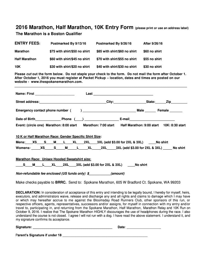 Get the free 2016 Marathon Half Marathon Five Mile Entry Form please print or use an address label