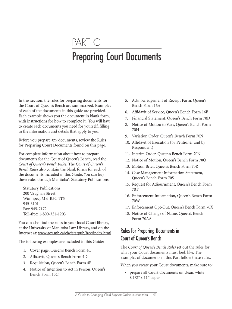 PART C Preparing Court Documents In this section, the rules for preparing documents for the Court of Queen's Bench are summarized. Examples of each of the documents in this guide are provided. Each